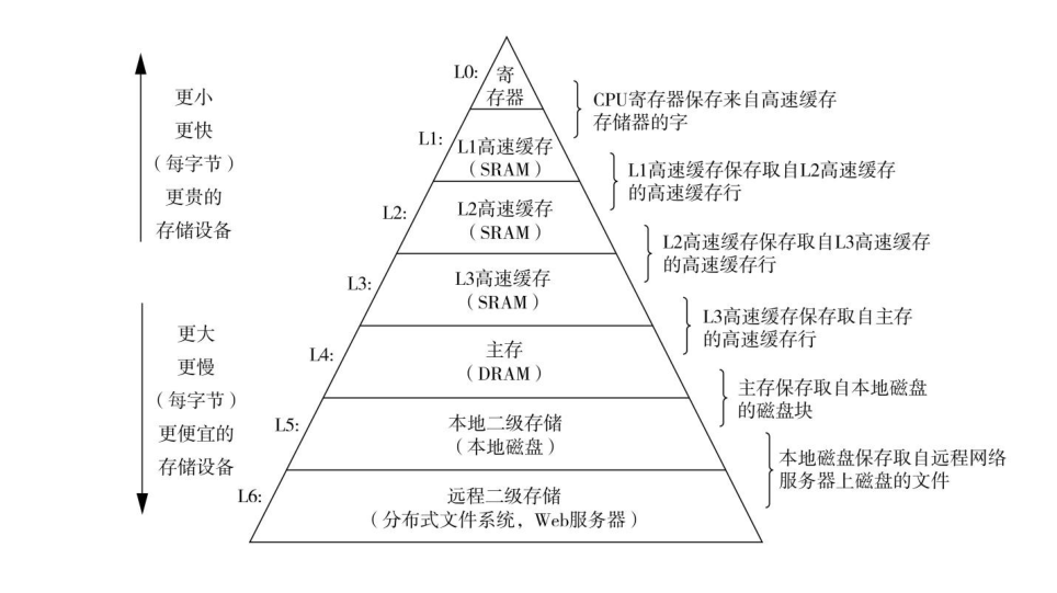 存储器系统(memory system)是由不同容量、成本和访问时间的存储设备组成的层次结构。在这个层次结构中:CPU 寄存器保存最常用的数据。靠近 CPU 的小的、快速的高速缓存存储器作为相对慢速的主存储器中数据和指令的缓冲区域。主存又作为容量较大、速度较慢的磁盘上数据的缓冲区域。而磁盘又可以作为通过网络中其他机器上数据的缓冲区域。